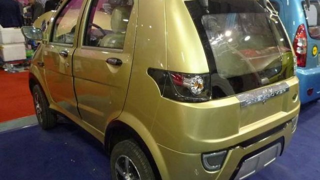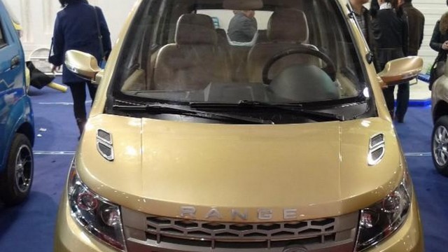 Este mini RR Evoque com motor eléctrico de 4cv, de nome Longer Yuelang X1, ostenta o logo da marca da oval verde, mas os centros das jantes possuem o logo da ... BMW! E é de facto tão mini que apenas tem a inscrição RANGE por não ter largura suficiente para colarem o resto da marca...
